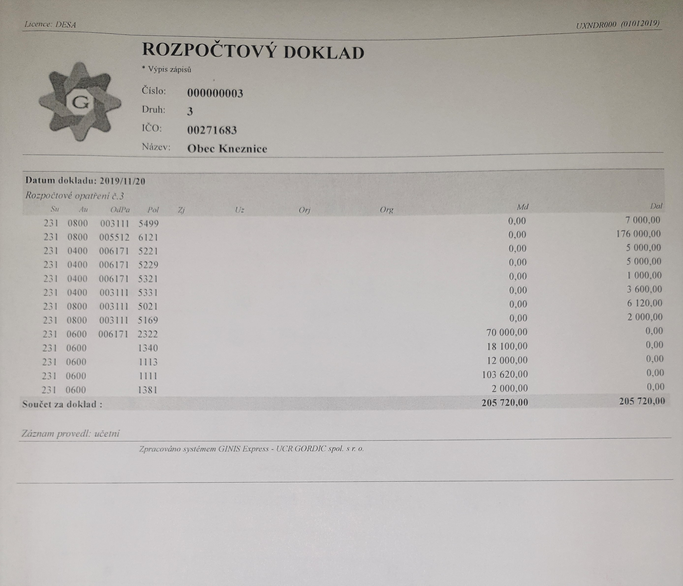 Rozpočtové opatření č. 3 z 20.11.2019