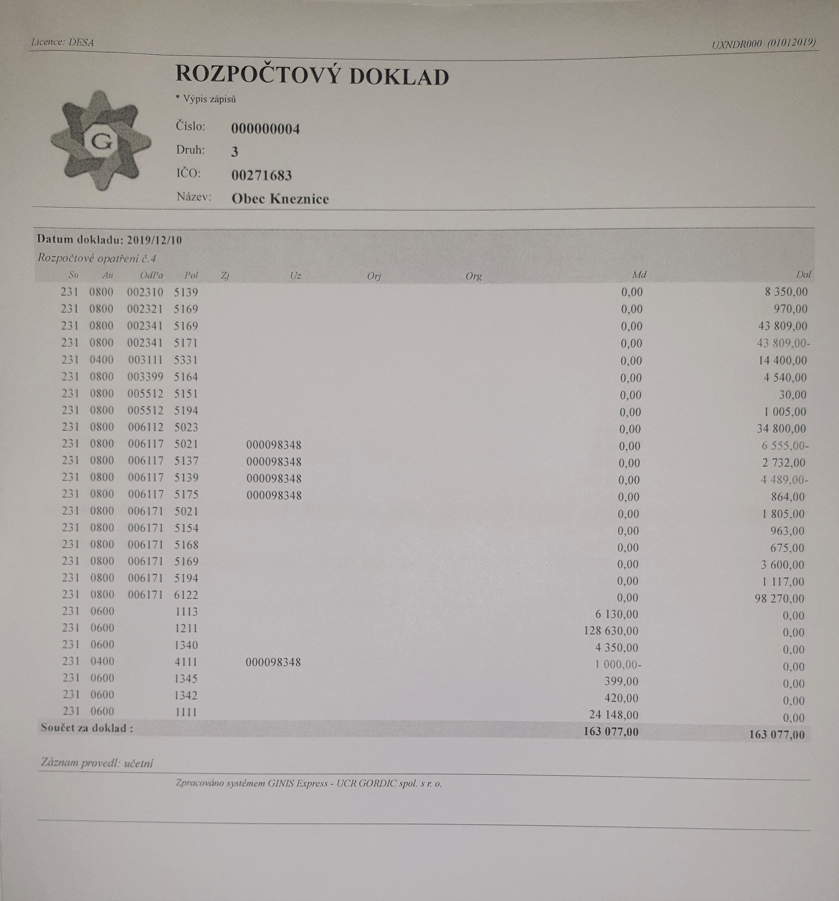Rozpočtové opatření č. 4 z 10.12.2019