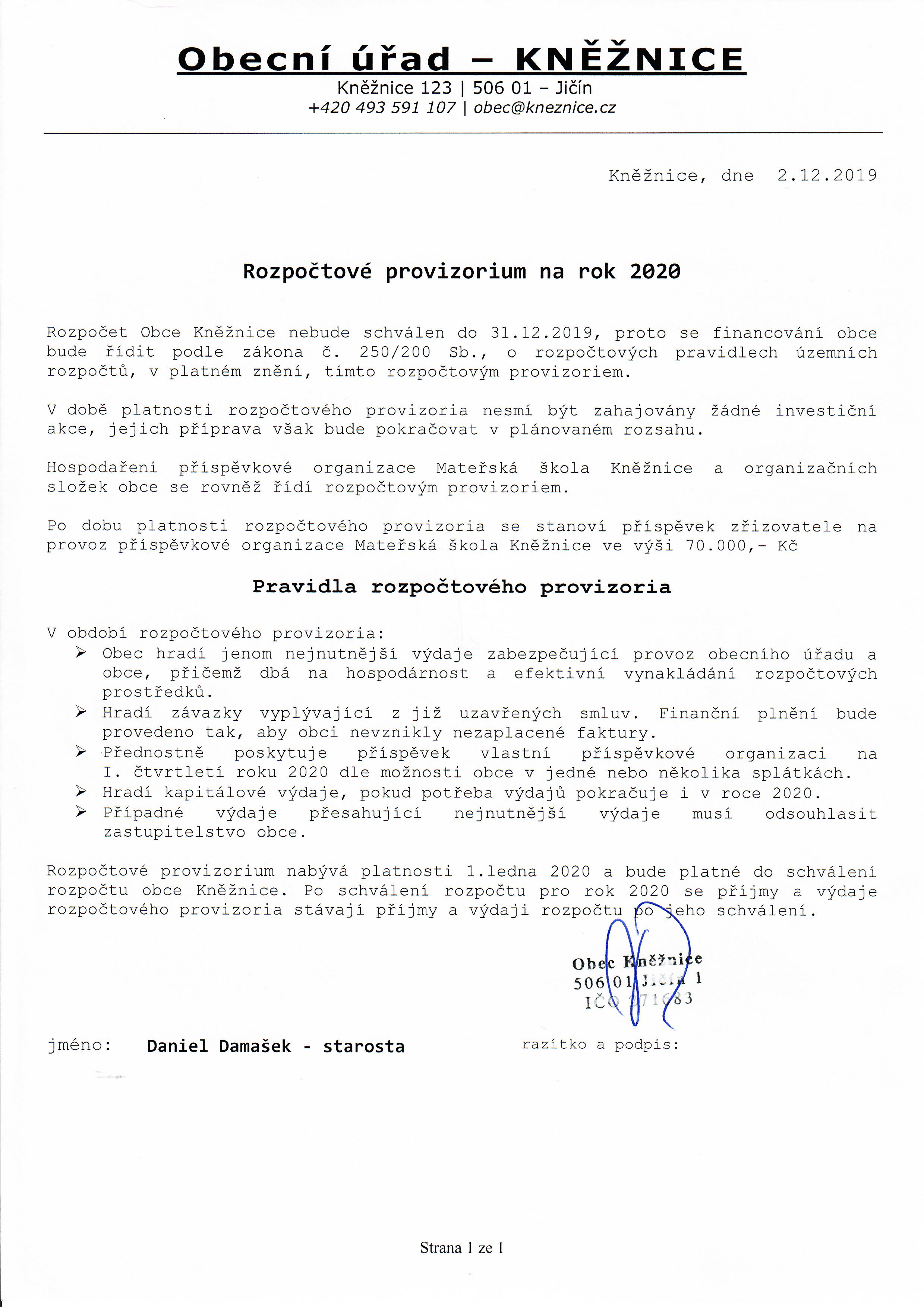 Rozpočtové provizorium na rok 2020 schválené zastupitelstvem 02.12.2109.