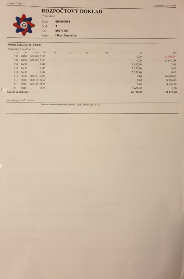 Rozpočtové opatření č.1 ze dne 27.08.2019 schváleno starostou obce 20/09/2019, informace zastupitelstvu dne 07.10.2019.