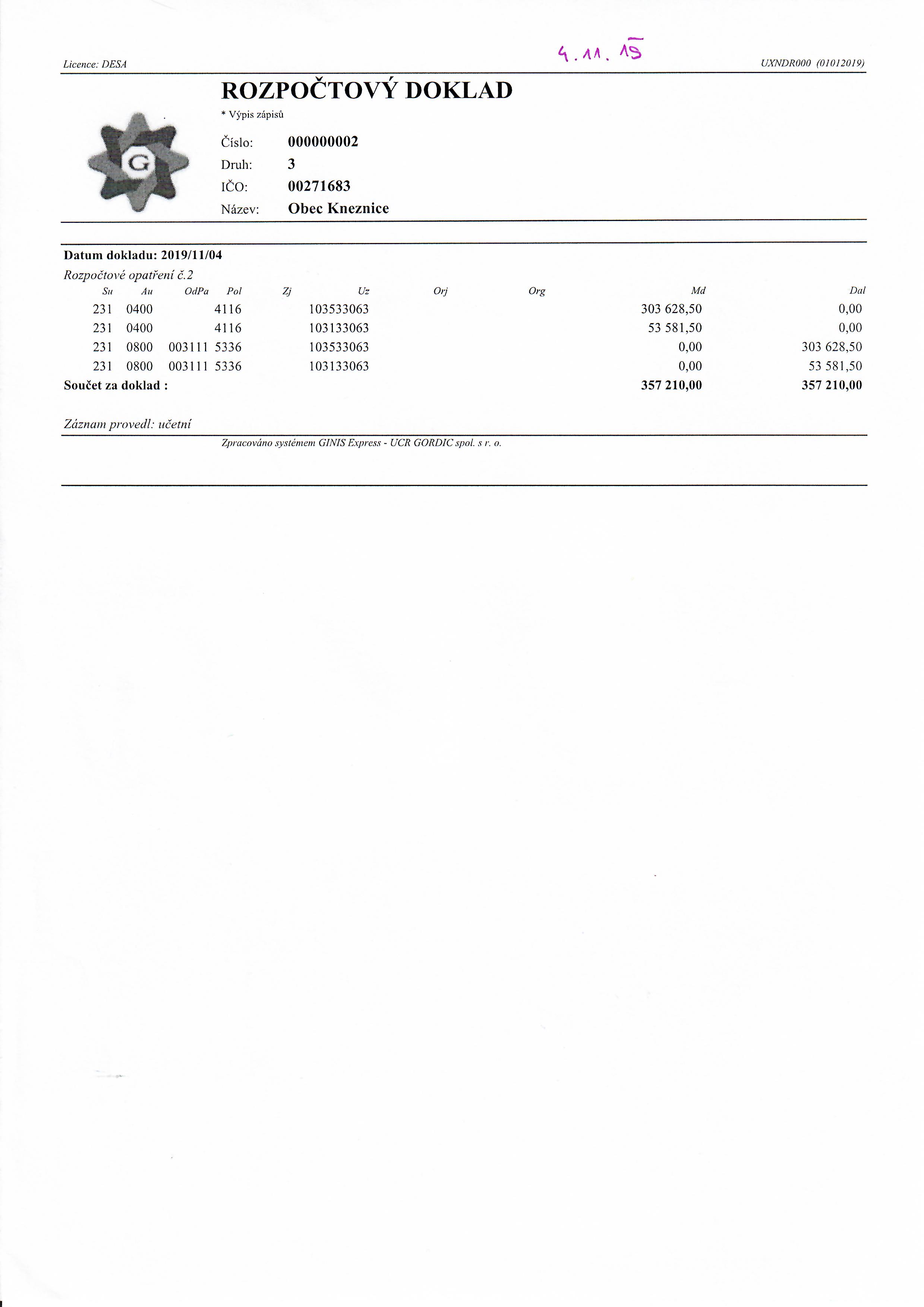 Rozpočtové opatření č.2 ze dne 04.11.2019 schváleno zastupitelstvem dne 04.11.2019.
